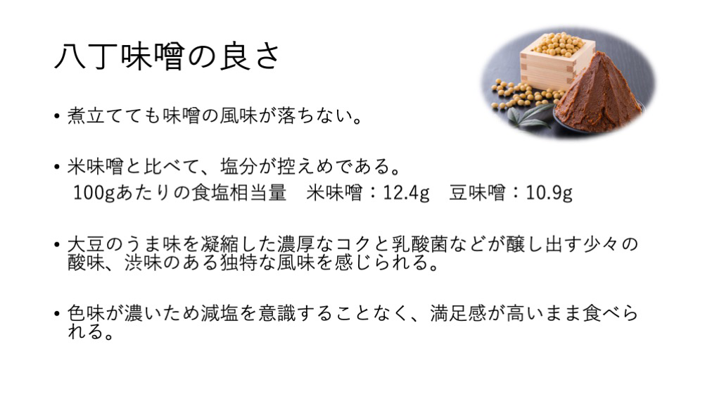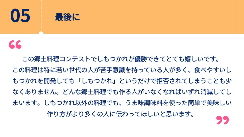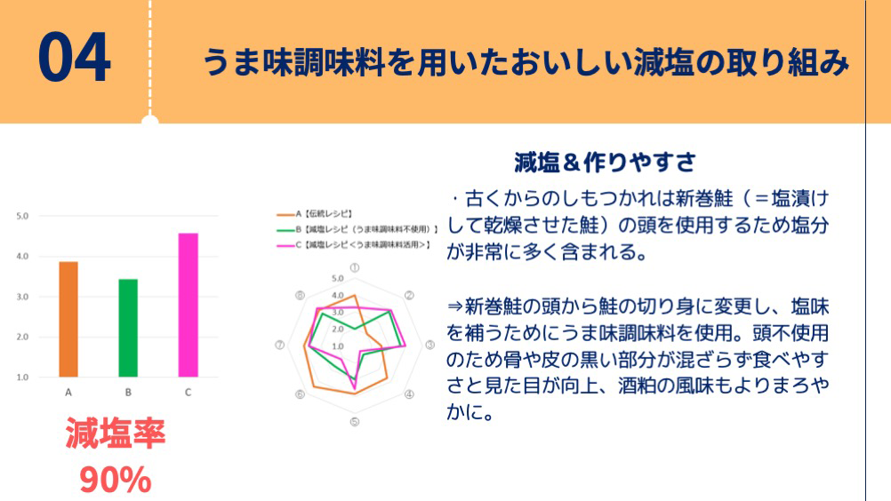今回のコンテストで分かったことは、全ての参加者が、この優れた郷土料理を何とか残したいという情熱を持っていたことでした。このコンテストは主題に減塩を掲げているのですが、郷土料理でこれを実践することは難題なのです。その理由は、最初にお話しした通り、国土が狭く気温の変化が激しい自然環境の中で食料を保存するために塩漬けにしているので、減塩にするとおいしくなくなるからです。そのことをカバーするためにうま味を活用したのです。