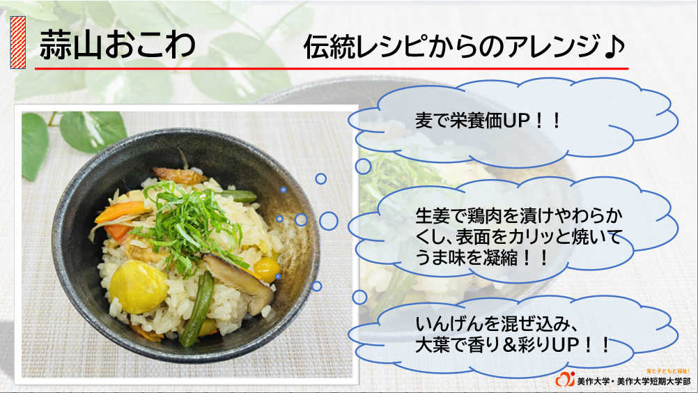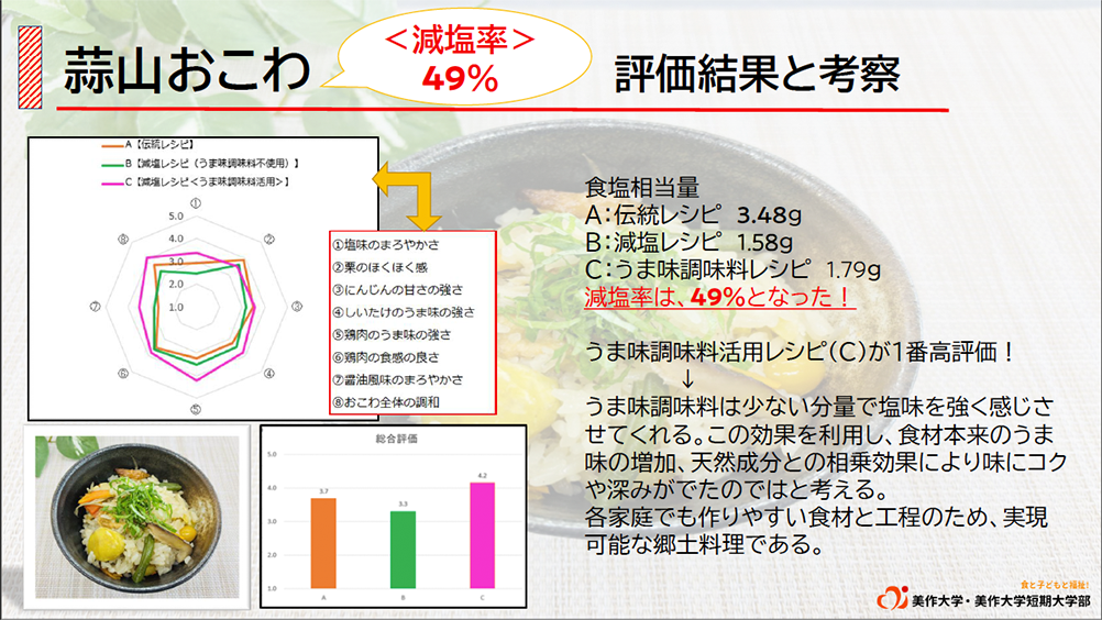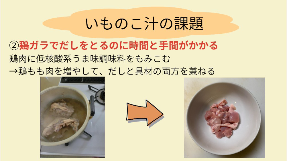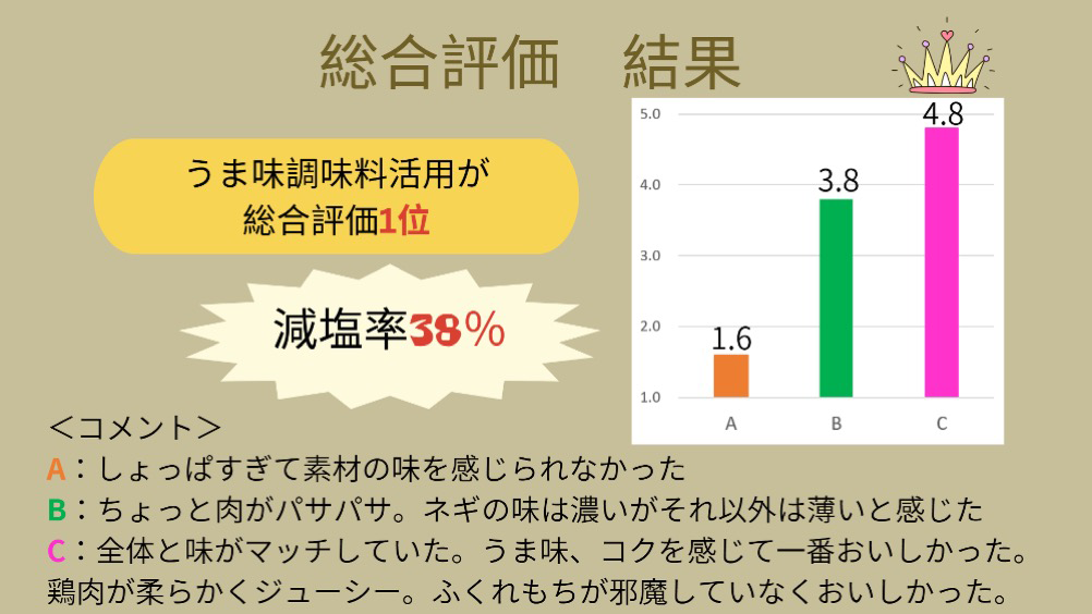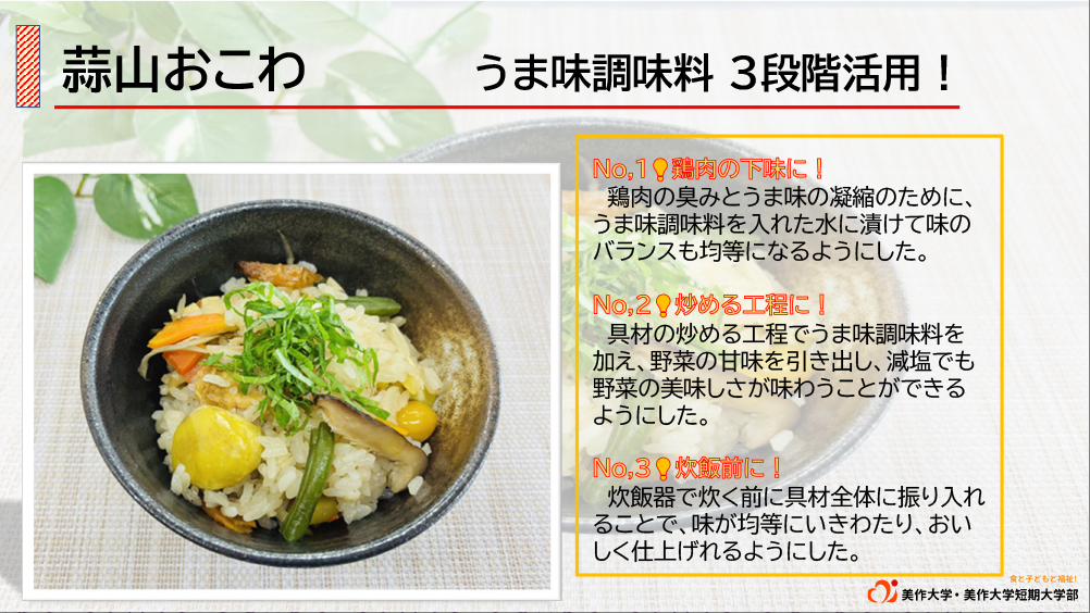 地元の食材にこだわり、自然にレシピに盛り込まれている点が素晴らしく、食材の分量や種類のバランスも上手に取られていました。うま味調味料の使い方に関しても、鶏肉には低核酸系うま味調味料を、植物性の食材には高核酸系のものを使い分けるなど、テクニックが光っています。家族で一緒に作れる調理プロセスを取り入れている点や、調理科学の理論をうまく生かしている点にも感心しました。