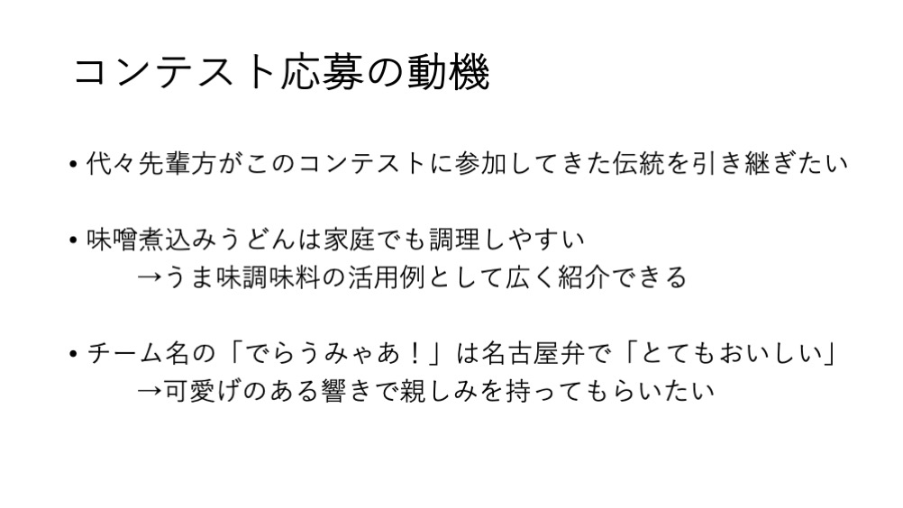 レポートでは、料理の歴史や八丁味噌の特徴についても詳しく書かれていました。茹でうどんを使ってレシピを構成しようとした思い切りも良かったと思います。また、味噌の量を減らしてうま味調味料を活用しながら、全体の味のバランスを見ておいしさを設計しており、さらに栄養面でもPFCバランスが良い料理になっていました。簡便性を高めるために作り方を見直し、うま味を活用して完成したレシピはとても優れていると思いました。