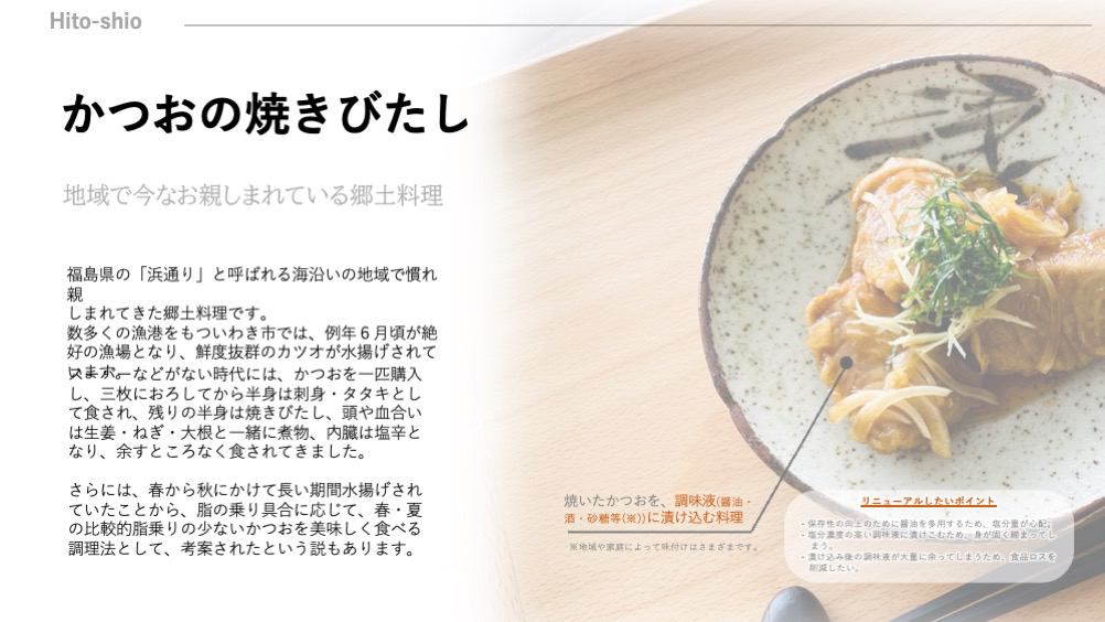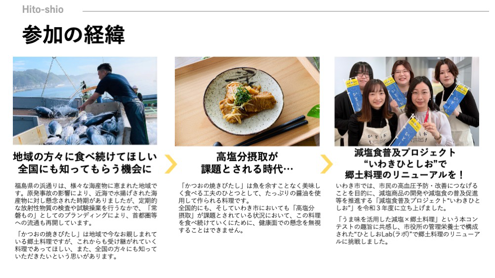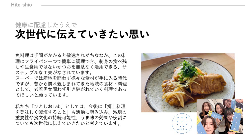 今も昔もずっと地域で愛されている料理ですが、郷土料理の欠点とも言える「塩分が高い」という部分を克服し、さらに一般の家庭でも、魚が少し苦手な方でも調理しやすいレシピに展開されていて、本当に素晴らしいと感じました。調理法でも減塩の取り組みがとても丁寧にされており、また、何度も試作してレシピを完成させた点も良かったと思います。常磐ものへのイメージ向上に貢献したいという思いにも共感しました。応援しています。