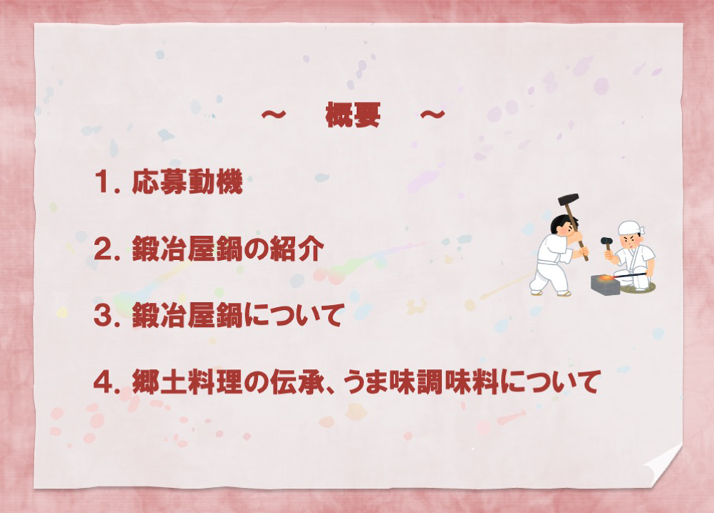 皆さんの発表を聞いていて分かったことがあります。それは、郷土料理には、その創設と継続に関わった人々の人生があり、郷土をこよなく愛する思いがあることです。