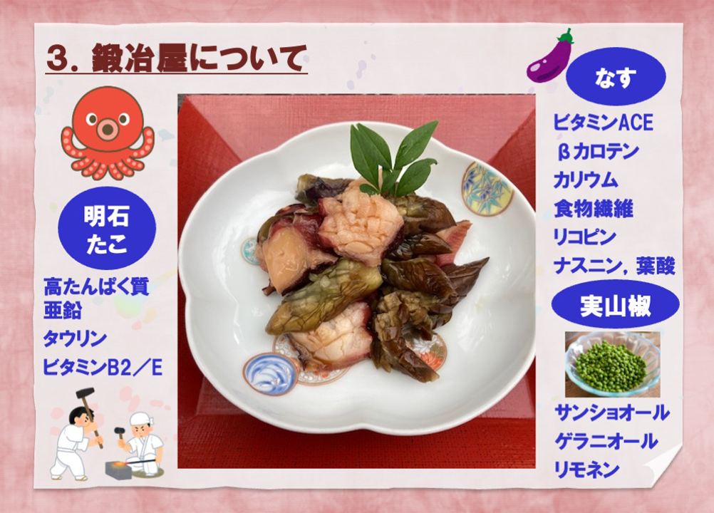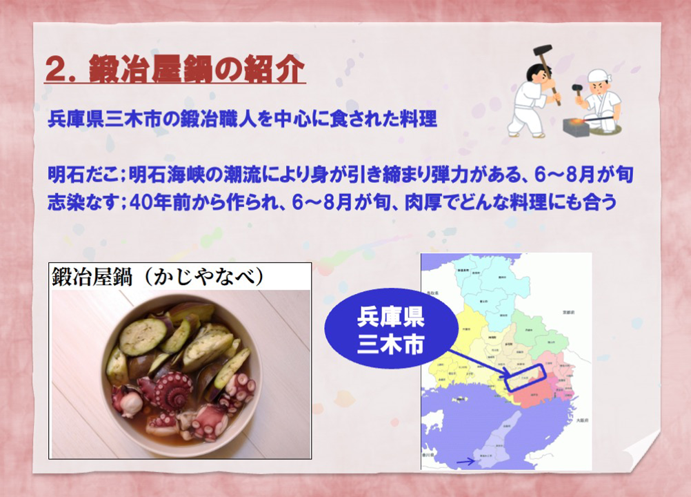 兵庫県の内陸地域にある鍛冶の町・三木にて、明石からの行商人から買った生命力の強いたこを使って鍛冶の残り火で作ったという鍛冶屋鍋には、郷土料理ならでのストーリー性があると感じました。