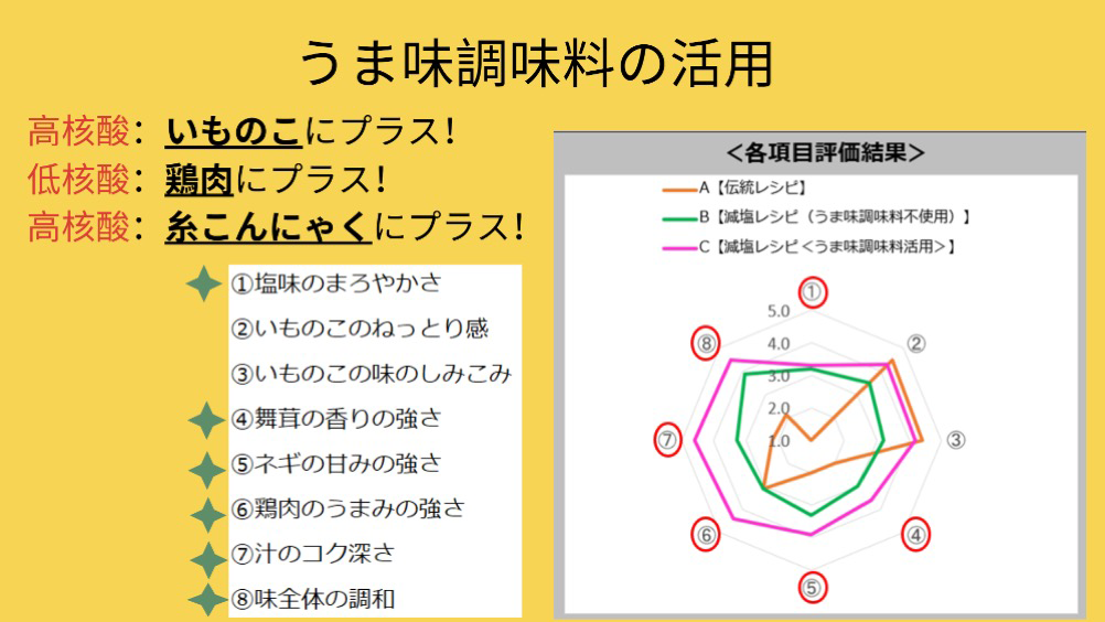 地元の食材にこだわり、自然にレシピに盛り込まれている点が素晴らしく、食材の分量や種類のバランスも上手に取られていました。うま味調味料の使い方に関しても、鶏肉には低核酸系うま味調味料を、植物性の食材には高核酸系のものを使い分けるなど、テクニックが光っています。家族で一緒に作れる調理プロセスを取り入れている点や、調理科学の理論をうまく生かしている点にも感心しました。