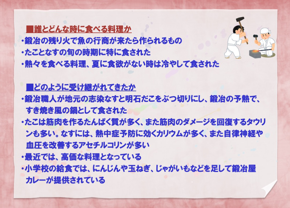 兵庫県の内陸地域にある鍛冶の町・三木にて、明石からの行商人から買った生命力の強いたこを使って鍛冶の残り火で作ったという鍛冶屋鍋には、郷土料理ならでのストーリー性があると感じました。