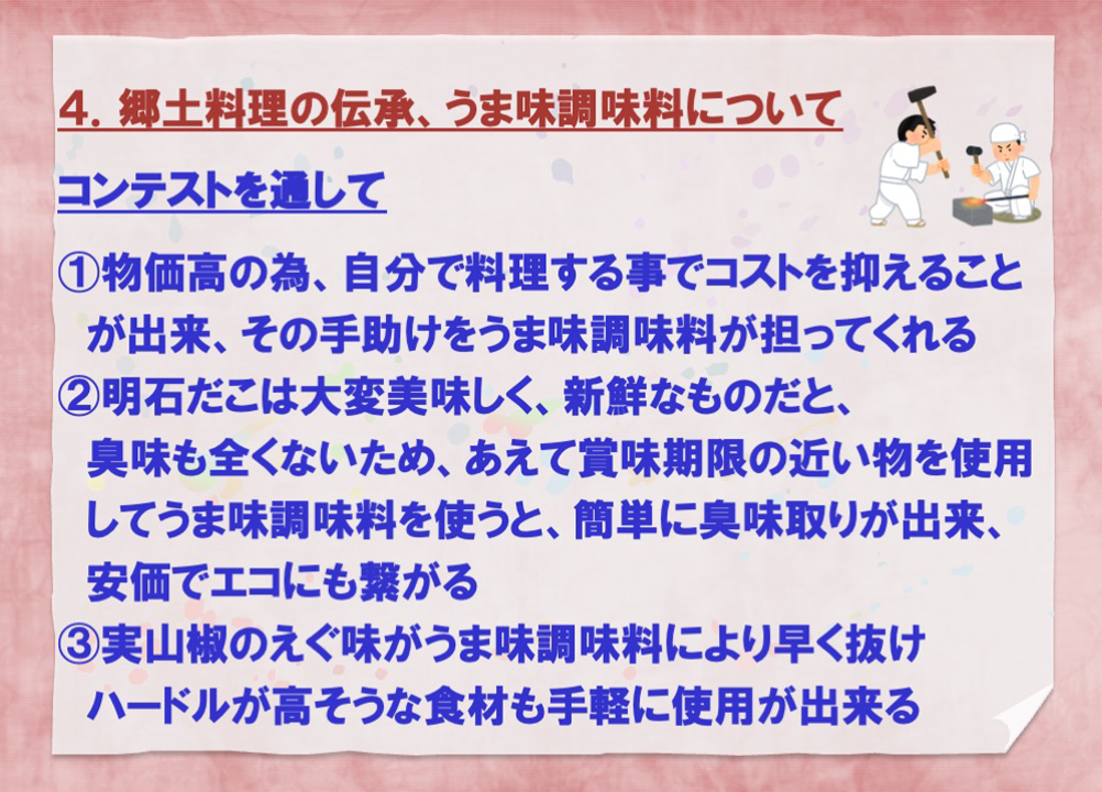 今回のコンテストで分かったことは、全ての参加者が、この優れた郷土料理を何とか残したいという情熱を持っていたことでした。このコンテストは主題に減塩を掲げているのですが、郷土料理でこれを実践することは難題なのです。その理由は、最初にお話しした通り、国土が狭く気温の変化が激しい自然環境の中で食料を保存するために塩漬けにしているので、減塩にするとおいしくなくなるからです。そのことをカバーするためにうま味を活用したのです。