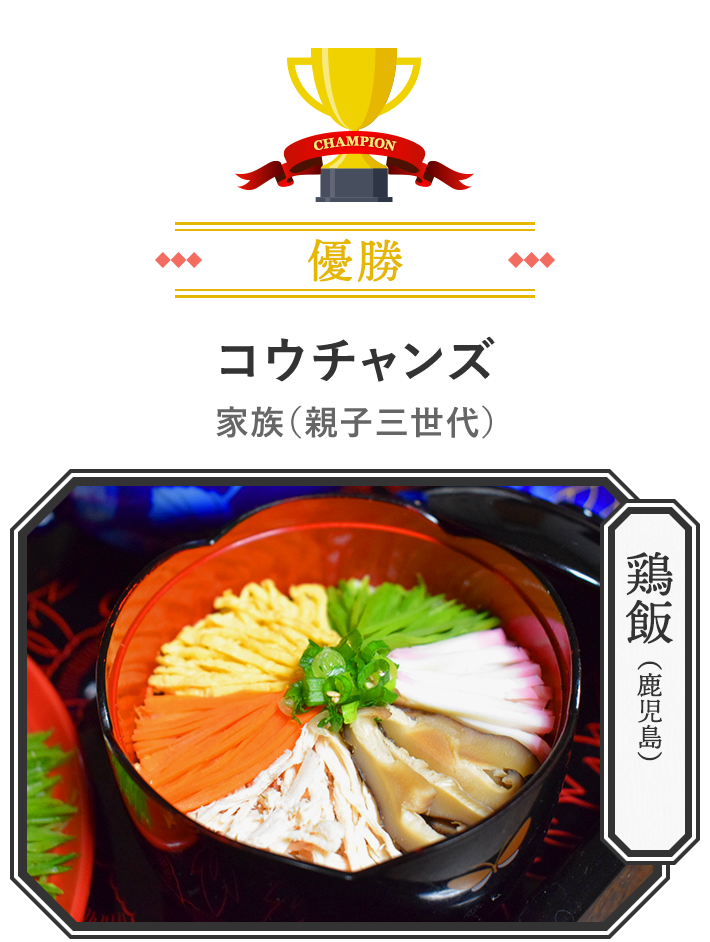 郷土料理の中には、「鶏飯」のように炊飯器や冷ご飯などを活用することで非常に簡単に作れて栄養バランスが良く、誰もが満足のいく料理があるということをぜひ多くの方に知っていただきたいです。また郷土料理の伝承は、インターネットなどを通して一般に広めるだけではなく、昔ながらの知恵がある祖父母から若い世代の孫への伝承など、身近な家族間でも行うことが出来るということを今回3世代でコンテストに挑戦して改めて強く実感しました。うま味調味料を使用するのは今回が初めてでしたが、もっと早くから知って使っていれば良かったと思うほど、たったひと手間でできる料理への効果性と利便性の高さに驚かされました。郷土料理本来の魅力や食べる人の満足感を損なうことなく、減塩すると同時に料理のうま味やまろやかさなどを効果的に高め、近くのスーパーなどで手軽に手に入るうま味調味料は、このコンテストを通して郷土料理とともに多くの方に知っていただき、様々な料理に活用してほしいと思います。