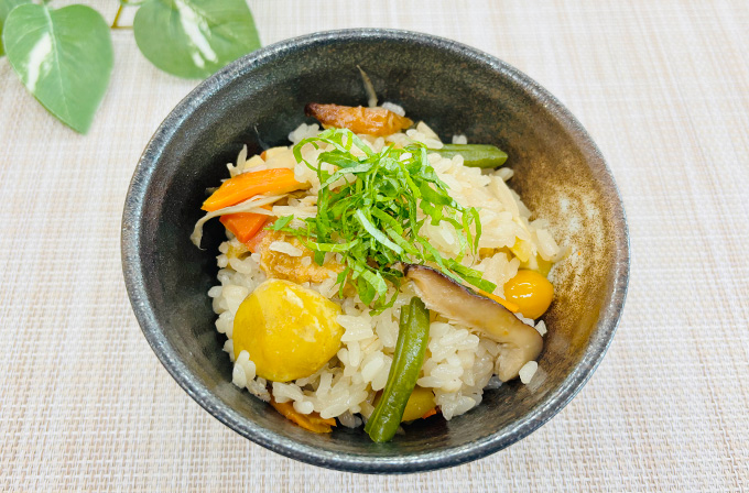 トップ レシピ〜うま味の活用〜 蒜山おこわ(岡山) テーマ 郷土料理、減塩 2026年02月26日 UP 蒜山おこわ(岡山) もち米 麦 干ししいたけ 鶏もも肉 しょうが にんじん 油揚げ ごぼう たけのこ ちくわ さやいんげん 大葉 栗 ぎんなん 岡山 中国地方 減塩 郷土料理 コンテストレシピ 食塩相当量(1人分) 1.7g 減塩率49%(対伝統レシピ) うま味調味料ポイント! •鶏肉の臭みとうま味の凝縮のために、うま味調味料を入れた水に漬けることで味のバランスが均等になるようにした。 •具材を炒める工程で、うま味調味料を加え、野菜の甘味を引き出し、減塩でも野菜のおいしさが味わうことができるようにした。 •炊飯器で炊く前に具材全体に振り入れることで、具材の味が均等にいきわたり、おいしく仕上げれるようにした。 うま味調味料の活用術 ◉第10回「うま味調味料活用! 郷土料理コンテスト」2025 うま味活用賞 チーム:ミマたん 所属:美作短期大学 栄養学科2年 審査員コメント・受賞チームの味覚評価結果、受賞チームの応募用紙~郷土料理魅力PRシート~はコチラ 材料4人分 もち米 2カップ弱(320g) 麦 1/4カップ強(32g) 水(干ししいたけの 戻し汁と合わせて) 2カップ 鶏肉もも 80g 高核酸系うま味調味料(A) 小さじ1/3強(1.2g) しょうが 4g にんじん 80g 油揚げ 28g ごぼう 80g 干しいたけ 4g たけのこ 40g ちくわ 20g いんげん 40g 大葉 4g 油 小さじ2 高核酸系うま味調味料(B) 8ふり(0.8g) 濃口しょうゆ 小さじ2 みりん 小さじ2 砂糖 大さじ1弱 塩 小さじ2/3 栗 160g ぎんなん 40g 高核酸系うま味調味料(C) 8ふり(0.8g) うま味調味料ってなんだろう? 作り方 もち米と麦を合わせ洗っておく。 ナイロン袋に鶏肉と高核酸系うま味調味料(A)、少量の水(分量外)を加え30分ほどおく。30分後に取り出し、しょうがのすりおろしをまぶして、表面がカリっとするくらいまで焼き、ひと口大に切る。 にんじん・油揚げは短冊切り、ごぼうはささがき、干しいたけは戻してスライス、たけのこ・ちくわはひと口大に切る。(干しいたけの戻し汁は残しておく) いんげんは下ゆでして3cm長さに切り、大葉はせん切りしておく。 フライパンに油を熱し、③の具材を炒め、高核酸系うま味調味料(B)、しょうゆ・みりん・砂糖・塩を加えて炒める。 炊飯器に①を入れ、②・⑤の順でのせる。その後、水と③の干しいたけの戻し汁を合わせたもの2カップを加え、栗、ぎんなんをのせ、高核酸系うま味調味料(C)をふり入れ、炊飯器のスイッチを入れる。 炊きあがったら、④のいんげんを混ぜ、茶碗に盛りつけ、④の大葉をのせる。 〈伝統レシピの調理手順〉 ②鶏肉に生姜をまぶし、カリっと焼く工程。 ⑦伝統的な郷土料理はいんげんを散らすが、今回混ぜ込み大葉を飾り付けた。 関連レシピ しもつかれ(栃木) いものこ汁(秋田) 味噌煮込みうどん(愛知) かつおの焼きびたし(福島) 鍛冶屋鍋(兵庫) とろろ汁(静岡) はす蒸し(石川) 福山鯛うずみ(広島) サメの納豆汁(秋田) 鯉こく(長野) 青森県三戸郡 ひっつみ汁(青森) 中身汁(沖縄県) ひゅうが飯(愛媛県) 根曲がり竹のみそ汁(長野県) 馬かやき(秋田県) レシピを探す 詳しく検索 テーマ すべて 時短・簡単 減塩 郷土料理 主食 主菜 副菜 汁物 デザート レンジ ゆでる 和える 炒める 焼く 煮る 蒸す 揚げる 春 夏 冬 秋 通年 食材 すべて 馬 もち米 ごはん・米 麺 卵 果物 海藻・乾物・こんにゃく 牛 粉類 豆類・大豆加工品 豚 野菜 魚介 鶏 料理家 すべて つくりおき食堂 まりえさん 木内由紀さん 川津由紀子さん 佐藤 加奈子さん 今日のおうちごはんさん まこりんとペン子さん maina(米山真衣)さん RINATY(りなてぃ)さん おねこさん 小春(ぽかぽかびより)さん 道添明子〈あーぴん〉さん 五十嵐豪さん 五十嵐ゆかりさん ほりえさちこさん リュウジさん 渡辺あきこさん 閉じる レシピ~うま味の活用~ レシピトップ レシピ 注目!!特集レシピ ラク速ゆかりレシピ監修 うま味くんレシピ リュウジさんの 爆速レシピ ほりえさちこ先生考案 体に嬉しい減塩味噌汁レシピ ほりえさちこ先生考案 野菜が好きになる! 郷土料理コンテスト受賞作品レシピ うま味応援団一覧 うま味調味料ってなんだろう? 7月25日は「うま味調味料の日」 食育応援!お役立ち情報